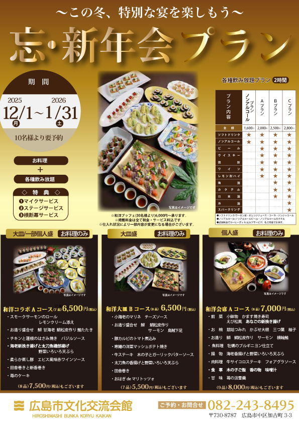 ✨忘・新年会プラン 2025/12/1~1/31✨ 施設からのお知らせ コンサートホール ウエディング レストラン 会議 2025年10月20日 【忘・新年会プラン】ご予約承り中! 大中小のご宴会場をご用意いたします。 チラシPDF Tweet