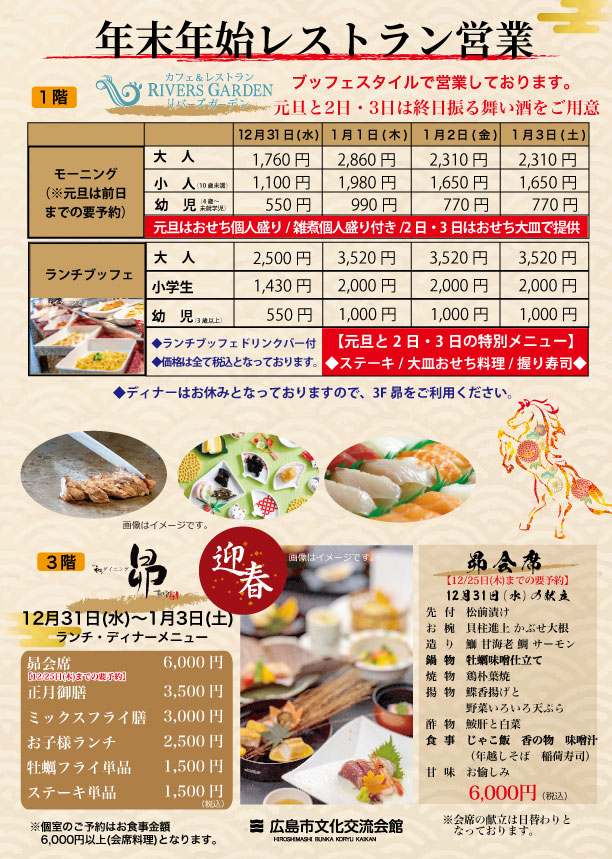 年末年始レストラン営業のご案内 施設からのお知らせ レストラン 2025年11月30日 当館1Fレストラン レストランリバーズガーデン、3F和ダイニング昴より 「年末年始営業」のお知らせです。 営業日、料金等詳細はチラシまたはTELにてご確認ください。 ※詳細チラシPDFはこちら Tweet