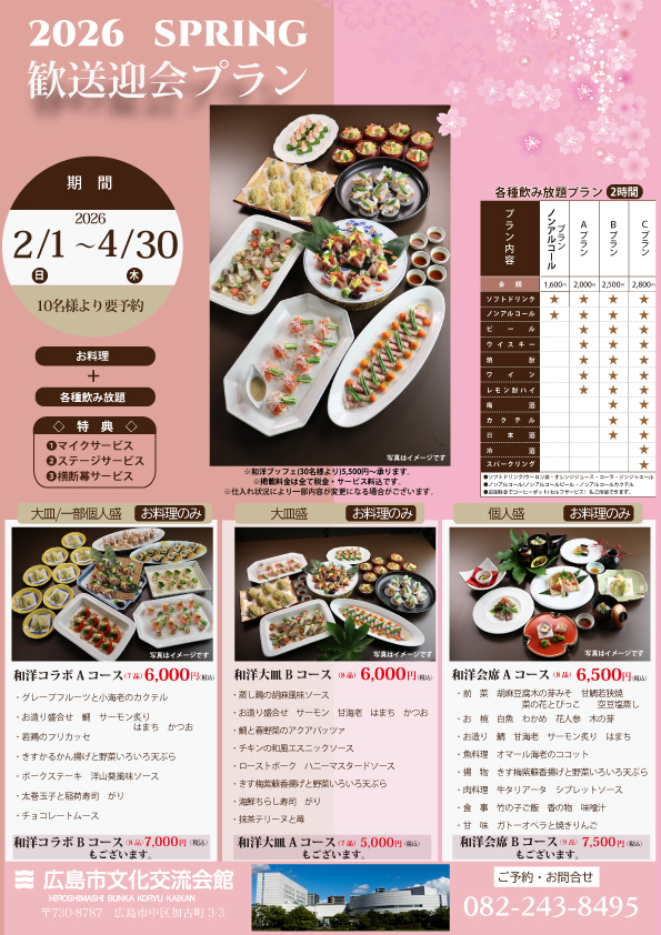 🌸2026歓送迎会プラン 2026/2/1~4/30🌸 施設からのお知らせ コンサートホール ウエディング レストラン 会議 2025年12月9日 【2026歓送迎会プラン】ご予約承り中! 大中小のご宴会場をご用意いたします。 チラシPDF Tweet