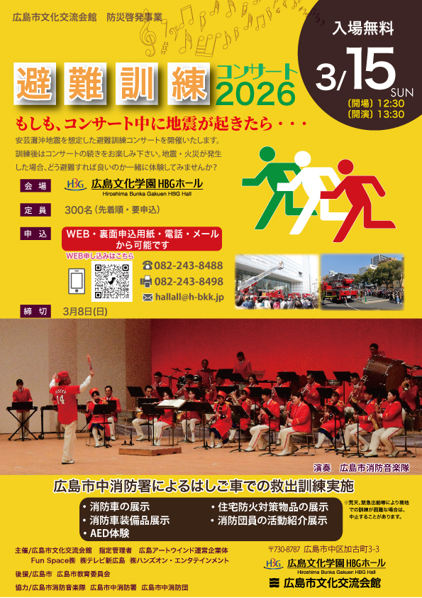 コンサート中に地震発生を想定し避難していただきます。それ以降はコンサートをお楽しみいただきます 防災イベント予定:消防車展示、AED]体験、消防車装備品の展示、消防団員の活動紹介展示、住宅防火対策物品の展示 |
