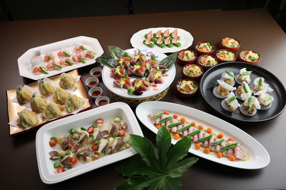 - 前 菜 小鉢物 かます焼き寿司 えび松風 あなごの新挽き揚げ